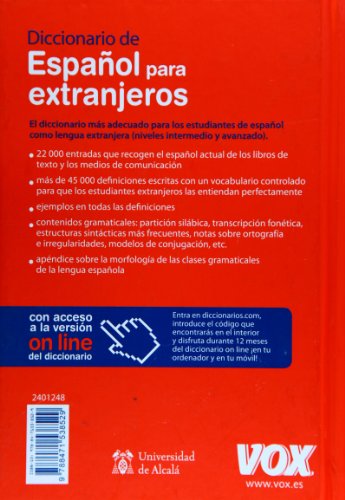 ¡CON ACCESO A LA VERSIÓN ON LINE DEL DICCIONARIO! VOX y la Universidad de Alcalá de Henares han coeditado el primer diccionario para el aprendizaje del español como lengua extranjera, que cuenta con la homologación del Instituto Cervantes. El diccionario más adecuado para los estudiantes de español como lengua extranjera de niveles intermedio y avanzado. EL ESPAÑOL MÁS ACTUAL 22 000 entradas y más de 45 000 significados que son reflejo del español actual hablado y escrito: han sido seleccionados de libros de español para extranjeros y de un corpus de español de más de 10 millones de palabras. FÁCIL DE COMPRENDER Definiciones sencillas y claras escritas con un vocabulario restringido de 2 000 palabras, las más frecuentes y rentables del español, y control de las estructuras gramaticales, con lo que el lector no tendrá problemas para comprender los significados. NUMEROSOS EJEMPLOS Todas las definiciones llevan ejemplos para ayudar al lector a entenderlas mejor y a producir mensajes. AMPLIA INFORMACIÓN Todas las entradas llevan indicación de la pronunciación y división silábica, los verbos y adjetivos señalan el tipo de complemento más habitual y hay numerosas notas sobre ortografía, género y plural irregulares, construcciones dudosas, preposiciones usadas con ciertas palabras, modelo de conjugación, etc. APÉNDICE GRAMATICAL Un breve apéndice gramatical ofrece los modelos de conjugación de los verbos regulares e irregulares. Realizado por un equipo de especialistas en la enseñanza de español par extranjeros de la Universidad de Alcalá para responder a las necesidades que tienen los estudiantes de español. Homologado por la Dirección Académica del Instituto Cervantes para la enseñanza y el aprendizaje de la lengua española. Esta edición incluye el acceso gratuito a diccionarios.com durante 12 meses para disfrutar del diccionario ¡en tu ordenador y en tu móvil!