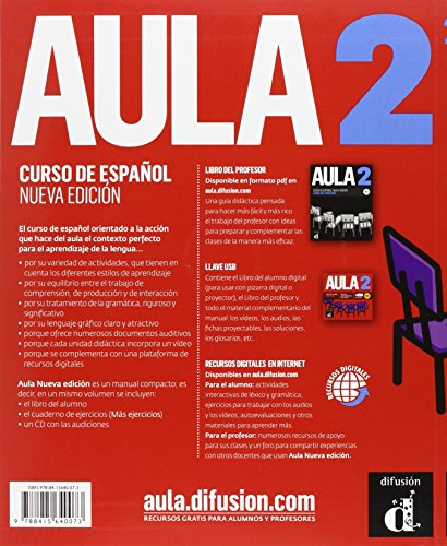 Aula 2 Nueva edición Libro del alumno es el segundo nivel de este nuevo curso general de español que está especialmente recomendado para alumnos que estudian español en contexto de inmersión. Esta nueva edición mantiene las innovaciones incorporadas en este curso que permitirán al alumno aumentar sus conocimientos de la lengua española de una manera sólida y eficaz, dándole las herramientas lingüísticas, culturales y estratégicas para comunicarse y seguir avanzando. La revisión renueva el aspecto gráfico, las fotografías y las ilustraciones, con contenidos sociales y culturales actualizados y nuevas dinámicas revisadas por un equipo de asesores con gran experiencia, además incorpora más documentos auditivos e introduce actividades en la red.