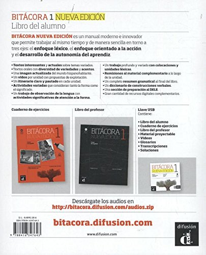 Bitácora 1 Nueva edición es un manual moderno e innovador que permite trabajar al mismo tiempo y de manera sencilla en torno a tres ejes: el enfoque léxico, el enfoque orientado a la acción y el desarrollo de la autonomía del aprendiz. Textos interesantes y actuales sobre temas variados Textos orales con diversidad de variedades y acentos Una imagen actualizada del mundo hispanohablante Un vídeo por unidad con propuestas de explotación Un itinerario claro y pautado en cada unidad Actividades variadas que consideran tanto la forma como el significado Un trabajo de observación de la lengua con actividades significativas de atención a la forma Un trabajo profundo y variado con colocaciones y unidades léxicas Remisiones al material complementario a lo largo de la unidad Un completo resumen gramatical al final del libro Un diccionario de construcciones verbales Una sección de preparación al DELE Gran cantidad de recursos digitales complementarios