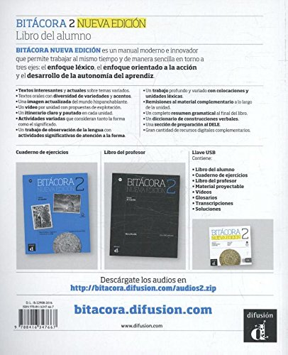 Bitácora 2 Nueva edición es un manual moderno e innovador que permite trabajar al mismo tiempo y de manera sencilla en torno a tres ejes: el enfoque léxico, el enfoque orientado a la acción y el desarrollo de la autonomía del aprendiz. Textos interesantes y actuales sobre temas variados Textos orales con diversidad de variedades y acentos Una imagen actualizada del mundo hispanohablante Un vídeo por unidad con propuestas de explotación Un itinerario claro y pautado en cada unidad Actividades variadas que consideran tanto la forma como el significado Un trabajo de observación de la lengua con actividades significativas de atención a la forma Un trabajo profundo y variado con colocaciones y unidades léxicas Remisiones al material complementario a lo largo de la unidad Un completo resumen gramatical al final del libro Un diccionario de construcciones verbales Una sección de preparación al DELE Gran cantidad de recursos digitales complementarios