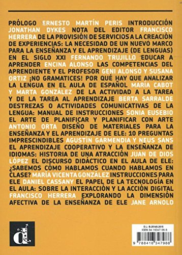 Dit is het eerste boek in een collectie gewijd aan de bijscholing van leraren Spaans als vreemde taal ELE) en is het resultaat van de samenwerking tussen International House en Difusión/Uitgeverij Talenland. De volgende artikelen staan in het boek: De la provisión de servicios a la creación de experiencias: la necesidad de un nuevo marco para la enseñanza y el aprendizaje (de lenguas) en el siglo xxi – Fernando Trujillo Educar a aprender – Encina Alonso Las competencias del aprendiente y el profesor – Susana Ortiz en Geni Alonso ¡No gramatices! Por qué hay que analizar la lengua en el aula de español – Marta González en María Cabot De la actividad a la tarea y de la tarea al aprendizaje – Berta Sarralde Destrezas o actividades comunicativas de la lengua: manual de instrucciones – Sonia Eusebio El arte de planificar y planificar con arte – Antonio Orta Diseño de materiales para la enseñanza y el aprendizaje de ele: 10 preguntas imprescindibles – Agustín Garmendia en Neus Sans El aprendizaje cooperativo y la enseñanza de idiomas: historia de una atracción – Juan de Dios López El discurso didáctico en el aula de ele: ¿sabemos cómo hablamos cuando hablamos en clase? – María Vicenta González Instrucciones para ELE – Daniel Cassany El papel de la tecnología en el aula: sobre la interacción y la acción digital – Francisco Herrera Explorando la dimensión afectiva de la enseñanza de ELE – Jane Arnold