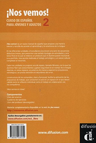 El nuevo manual de español ¡Nos vemos! propone una aproximación clara y sencilla a esta lengua. El libro del alumno, que consta de 12 unidades, es ideal para jóvenes y adultos que quieren alcanzar el nivel lingüístico necesario para viajar a los países de habla española y realizar estancias breves. Como en el caso de otros manuales de Difusión, ¡Nos vemos! se ha concebido para favorecer un aprendizaje basado en la acción, aunque su diseño sencillo permitirá aplicar este enfoque a los profesores acostumbrados a los libros más tradicionales. Las unidades de repaso permiten asentar los conocimientos adquiridos y llevar a cabo un proceso continuo de autoevaluación. Todas las unidades tienen una tarea final y siguen una progresión adecuada al Marco Común Europeo de Referencia. Nivel A2