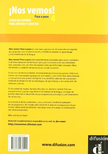 ¡Nos vemos! Paso a paso 4 está especialmente concebido para cursos modulares o de breve duración (30-40 horas) tanto por la estructura de sus contenidos (tres unidades más una final de repaso) como por el formato compacto (libro del alumno y cuaderno de ejercicios en un solo volumen). En las tres primeras unidades, el estudiante encontrará secuencias didácticas breves con una variada tipología de actividades y una tarea final para elaborar un documento que puede incorporar a su portfolio, además de una sección dedicada al desarrollo de las estrategias de aprendizaje y una propuesta de reflexión cultural. En la unidad de repaso, llamada Mirador, los alumnos podrán fijar sus conocimientos y ganar seguridad en el manejo de la lengua, sin dejar de prestar atención al desarrollo de su competencia estratégica y al tratamiento de los errores. La estructura de los contenidos, clara y funcional, facilita la aplicación de las propuestas de trabajo para convertir el aula en un espacio en el que tienen cabida tanto la reflexión individual como el trabajo en colaboración con otros estudiantes.