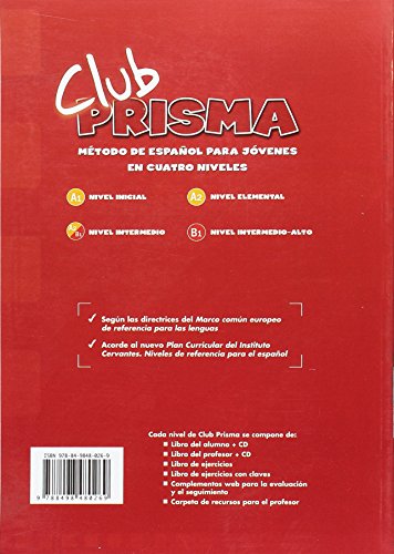 Club Prisma Nivel B1 – Ejercicios para el alumno Club Prisma es un manual que nace para satisfacer las necesidades de profesores y estudiantes jóvenes y adolescentes de español. Aúna diferentes tendencias metodológicas desde una perspectiva comunicativa a fin de proporcionar al joven estudiante de las estrategias y conocimientos necesarios para desarrollarse en un ámbito hispano. Aúna diferentes tendencias metodológicas desde una perspectiva comunicativa a fin de proporcionar al estudiante adolescente de las estrategias y conocimientos necesarios para desarrollarse en un ámbito hispano.  Esta versión, fruto de varios años de trabajo de investigación metodológica, nace específicamente diseñada según las necesidades, estilos de aprendizaje e inquietudes de un alumnado tan especial como son los jóvenes. Sigue un enfoque comunicativo que, desde la perspectiva más actual y atendiendo a la realidad concreta del aula, apuesta por el eclecticismo. Potencia la interacción y la comunicación en clase, prestando especial atención al trabajo en parejas y grupos. Trata temas modernos y contenidos de máxima actualidad, adaptados a los gustos y preferencias de los jóvenes: música, moda, amistades, internet… Diseño con gran atractivo estético que provoca el interés de los estudiantes. Aprovecha el interés de los adolescentes por el uso de internet para proponer investigaciones y tareas en la red relacionadas con los contenidos de cada unidad y las cuales erán compartidas con los compañeros de clase. Gran diversidad de tipologías de actividades que garantiza el aprendizaje de forma inductiva y deductiva. Se incluye un Portfolio; documento promovido por el Consejo de Europa y en el que cada estudiante podrá anotar sus experiencias de aprendizaje del español. Las imágenes cumplen con una finalidad didáctica primordial. El conocimiento de la cultura y el trabajo intercultural se integran en cada unidad, formando parte de la secuencia didáctica y propiciando un aprendizaje global.