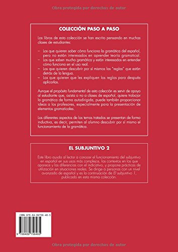 El subjuntivo 2 provides insight into the more complex functions of the subjunctive in Spanish. Each lesson is presented in context, allowing students to discover grammar functions organically. The grammar books of Colección Paso a paso are appropriate for both the self-directed student who wants to focus on grammar outside of the classroom, and the teacher who is looking for new techniques in grammar instruction. Topics are presented intuitively and in manageable segments, and language skills are arranged by level of difficulty.