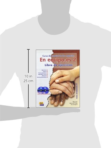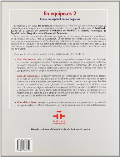 En equipo.es 2 – Libro de Ejercicios + 2 CDs Manual de español de los negocios para todos aquellos profesionales que quieren aprender el idioma centrando su atención desde el principio en el ámbito laboral. Este Libro de ejercicios permite al estudiante practicar y reforzar los contenidos aprendidos en el Libro del alumno. Método que sigue un modelo curricular comunicativo basado en el enfoque por tareas. Contiene un glosario, las claves de los ejercicios, un apéndice de direcciones web y las transcripciones del libro del alumno y del libro de ejercicios. El número de actividades de este Libro de ejercicios está pensado para mantener el  equilibrio entre las destrezas de comprensión lectora,  producción escrita y comprensión auditiva; al mismo tiempo se revisa la adquisición de la gramática. Ideal para estudiantes que trabajan en España o en Hispanoamérica en una multinacional, ejecutivos o personas interesadas en el español de los negocios. El contenido es motivador y se trabajan todas las destrezas (producción oral, interacción oral, comprensión lectora, comprensión auditiva y producción escrita). Según las directrices del Marco común europeo de referencia.