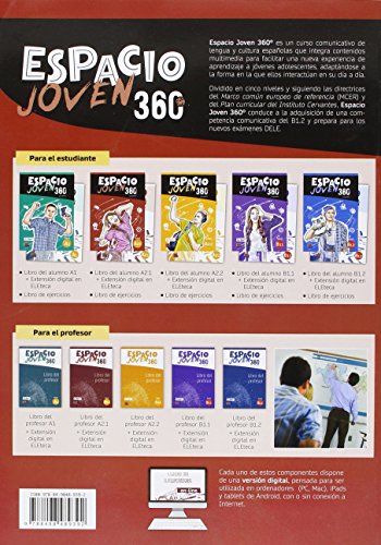 Dividido en cinco niveles y siguiendo las directrices del Marco común europeo de referencia (MCER) y del Plan curricular del Instituto Cervantes, Espacio Joven 360° conduce a la adquisición de una competencia comunicativa del B1.2 y prepara para los nuevos exámenes DELE.