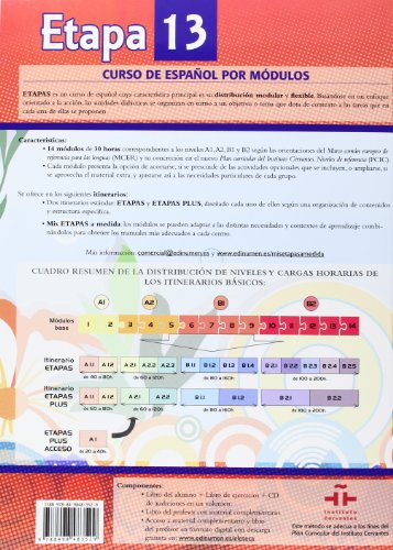 14 modules de 30 heures, qui suivent les orientations du CCER et du nouveau Plan curricular del Instituto Cervantes, basés sur une pédagogie actionnelle pour une utilisation modulable et flexible selon deux itinéraires possibles : “Etapas” et “Etapas Plus”. Chaque module comprend des activités optionnelles et complémentaires. Le livre réunit le cours, les exercices, un résumé linguistico-grammatical et le CD audio. Le guide pédagogique comprend des fiches pour transparents et une partie digitalisée pour utilisation sur TBI.