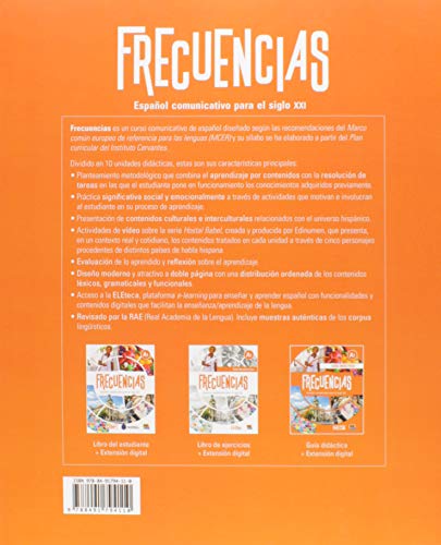 Frecuencias es un curso que da respuesta a las necesidades de estudiantes y docentes en cualquier contexto de aprendizaje del siglo XXI. Combina el aprendizaje por contenidos y la resolución de tareas que permiten a los estudiantes poner en práctica los conocimientos adquiridos anteriormente, lo que favorece un aprendizaje activo y eficaz. La presencia de aspectos culturales e interculturales, así como la integración destacada de las variantes hispánicas, facilitan la creación de una conciencia global del mundo hispánico y la adquisición de habilidades de comunicación por parte de los estudiantes. Además, el libro incorpora una extensa muestra de ejemplos reales extraídos de los corpus de la Real Academia Espanol (RAE) que, siempre al hilo de los contenidos tratados, ilustran variantes de carácter léxico, gramatical o comunicativo. El manual se acompana de un apéndice de Pronunciación y ortografía con diez fichas prácticas que trabajan el componente fonético y ortográfico y que pueden presentarse en clase según las necesidades específicas de cada grupo. El ebook incluye una extensión digital en la ELEteca con diversos recursos extras (disponibles durante 18 meses a partir del momento de su activación) : audiciones, actividades interactivas y vídeos de la serie Hostal Babel.