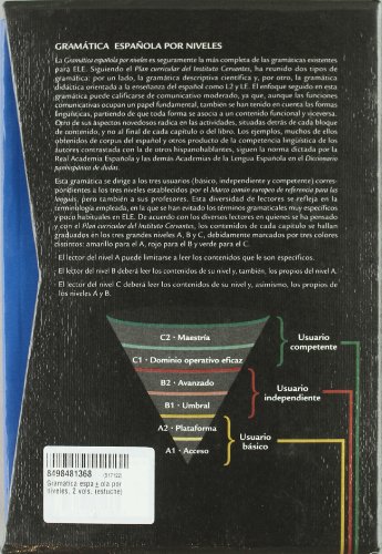 Gramática española por niveles La Gramática española por niveles está elaborada según el Plan curricular del Instituto Cervantes. Niveles de referencia para el español. Reúne dos tipos de gramática: por un lado, la gramática descriptiva científica y, por otro, la gramática didáctica orientada a la enseñanza del español como L2 y LE. En esta obra se concibe la gramática como un conjunto de herramientas que utilizan los hablantes y los oyentes para la construcción e interpretación de los mensajes. Se trata de un estudio completo de la gramática del español, teniendo en cuenta el carácter comunicativo de todos sus elementos. Las funciones comunicativas ocupan un papel fundamental, teniendo en cuenta las formas lingüísticas. Los ejemplos, muchos de ellos obtenidos de corpus del español, reproducen usos del español peninsular, con referencias a usos de español de América. Se ha seguido la norma dictada por la Real Academia Española y las demás Academias de la Lengua Española. Uno de los aspectos novedosos de esta gramática radica en sus mútiples actividaes, no situadas al final de cada capítulo ni del libro, sino detrás de los bloques de contenidos: Actividades que se atienen al contenido explicado, de tal manera que el alumno compruebe que ha comprendido las explicaciones previas, sin tener que recurrir necesariamente a fuentes externas. Unas actividades corresponden a ejercicios estructurales, otras inducen a una reflexión adicional por parte del alumno, a partir de ejemplos semejantes a los utilizados en las explicaciones.