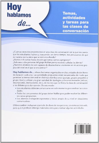 Hoy hablamos de… A1 + A2 Hoy hablamos de? es un manual para clases de conversación orientado a la práctica de la expresión e interacción orales y a la adquisición de una mayor competencia comunicativa. Dividido en dos niveles, según las directrices del Marco común europeo de referencia (MCER). La presentación de sus contenidos y dinámicas hacen de Hoy hablamos de? un material idóneo para las clases de conversación. Sesiones de trabajo diseñadas para que los alumnos tengan que comunicarse en cada momento para seguir avanzando. Los alumnos tendrán la oportunidad de poner en práctica, mediante actividades orales secuenciadas, los contenidos, funciones y estructuras aprendidos en clase. Presentación de una gran variedad de tipologías y discursos textuales (relatos, descripciones, instrucciones, etc.). Material estimulante: actividades cooperativas, de discusión, de intercambio de informaciones para llegar a acuerdos, etc. Dinámicas diferentes enmarcadas en distintos agrupamientos (parejas, grupos pequeños y grupo clase).