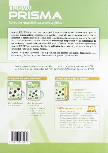nuevo Prisma C2 – Libro del alumno nuevo Prisma es un curso de español estructurado en seis niveles que sigue un enfoque comunicativo, orientado a la acción y centrado en el alumno con el fin de fomentar el aprendizaje de la lengua para la comunicación en español dentro y fuera del aula. Este curso supone una evolución de Prisma, con la actualización de textos y temas, y un renovado diseño gráfico. Además, incorpora nuevas herramientas interactivas y multimedia que aportan un plus al proceso de enseñanza/aprendizaje del español tanto dentro como fuera del aula. Enfoque comunicativo, orientado a la acción y centrado en el alumno: concepción comunicativa de la lengua que plantea el aprendizaje centrado en el alumno al que considera como un agente social que debe realizar tareas o acciones en diversos contextos socioculturales movilizando sus recursos cognitivos y afectivos. Organización de contenidos según las recomendaciones del MCER y conforme a los contenidos del PCIC. Actividades que trabajan el componente afectivo como estrategia para motivar el aprendizaje. Reflexión gramatical clara y accesible para el estudiante con actividades que hacen que el estudiante participe de modo activo en su adquisición. nuevo Prisma propone el aprendizaje de la gramática como un ingrediente más que debe estar al servicio de la comunicación, un instrumento que permite alcanzar el objetivo comunicativo planteado. Secuencias de actividades centradas en el trabajo cooperativo para que los alumnos trabajen juntos en la consecución de las tareas optimizando su propio aprendizaje y el de los otros miembros del grupo. Estrategias de aprendizaje y de comunicación para que el alumno reflexione sobre su proceso de aprendizaje. Reflexión intercultural y acercamiento a la diversidad cultural del mundo hispano. Apéndice con un modelo de examen C2 según los nuevos exámenes DELE, que permite evaluar los conocimientos adquiridos y entrenarse en la dinámica del examen. Diseño actual. Material digital e interactivo para el profesor y el alumno que enriquece el proceso de enseñanza/aprendizaje del español.