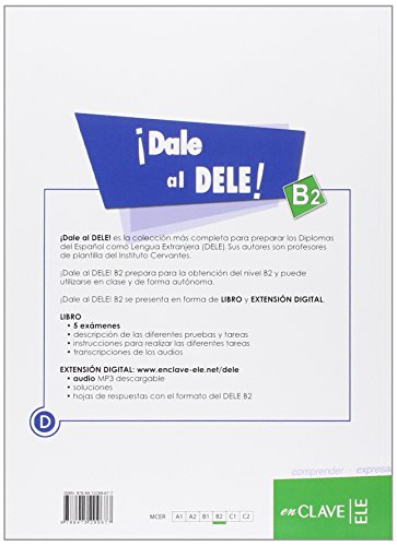 ¡Dale al nuevo DELE! B2 prepara para la obtención del nivel B2 y puede ser utilizado tanto en clase como de forma autónoma. En el libro hay 5 modelos de examen e instrucciones y estrategias para realizar las diferentes pruebas del examen (Comprensión de lectura, Comprensión auditiva, Expresión e interacción Escritas y Expresión e interacción Orales) y las transcripciones de los audios. El audio es descargable en MP3 y contiene los audios de las pruebas de Comprensión auditiva, Expresión e interacción orales (posibles preguntas del entrevistador). Sus autores son profesores de plantilla del Instituto Cervantes y formadores de los examinadores DELE.