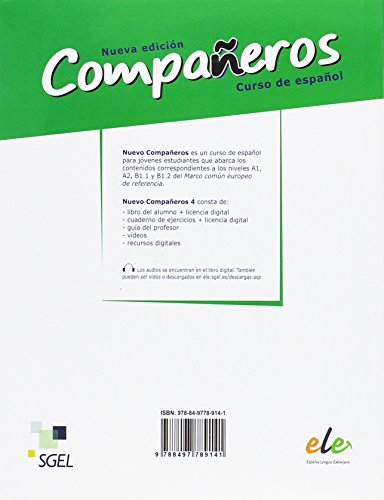 Dirigido a estudiantes de enseñanza secundaria de nivel B1.2 del MCER. Nueva edición actualizada y renovada con una propuesta didáctica coherente, entretenida, ágil y motivadora que sigue una progresión lógica de presentación y práctica de la lengua. Nueva maqueta y actualización de los contenidos y de algunas ilustraciones así como nuevas fotografías. Licencia digital con los contenidos, las audiciones y cientos de ejercicios interactivos incluida en el libro del alumno y el cuaderno de ejercicios. Dividido en 9 unidades. Ejercicios prácticos de vocabulario, gramática, comunicación y destrezas. Se puede utilizar en clase y en casa. Al final del cuaderno están las transcripciones de los audios. El cuaderno de ejercicios digital, en formato HTLM con diseño adaptativo para trabajar con distintos dispositivos. Los audios se encuentran en el cuaderno digital y pueden ser oídos o descargados en: ele.sgel.es/descargas.asp. Vídeos en YouTube, con escenas cotidianas y referencias culturales e interculturales. Un capítulo cada dos unidades Guía del profesor ampliada con propuestas didácticas para el libro y los vídeos, actividades extra y fichas fotocopiables para los estudiantes. Una unidad de muestra en: www.sgel.es/ele