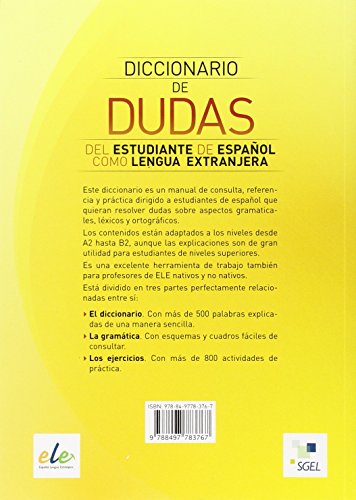 Destinado a estudiantes de ELE. Niveles A2-B1-B2 del MCER y para profesores. Material complementario para resolver dudas frecuentes. Contiene un diccionario de consulta, una gramática y ejercicios. Una herramienta de trabajo para profesores nativos y no nativos. Dividido en 3 apartados: I. Diccionario, con más de 500 dudas resueltas con ejemplos de uso contextualizados. II. Gramática, con explicaciones claras presentadas con esquemas y cuadros fáciles de consultar. III. Ejercicios, con más de 800 actividades para practicar, realizadas a partir de una selección de los ejemplos que se muestran en el Diccionario. Al final del libro aparece una clave con la solución de los ejercicios.